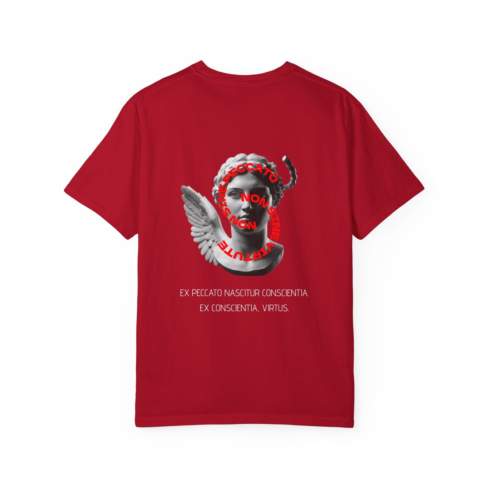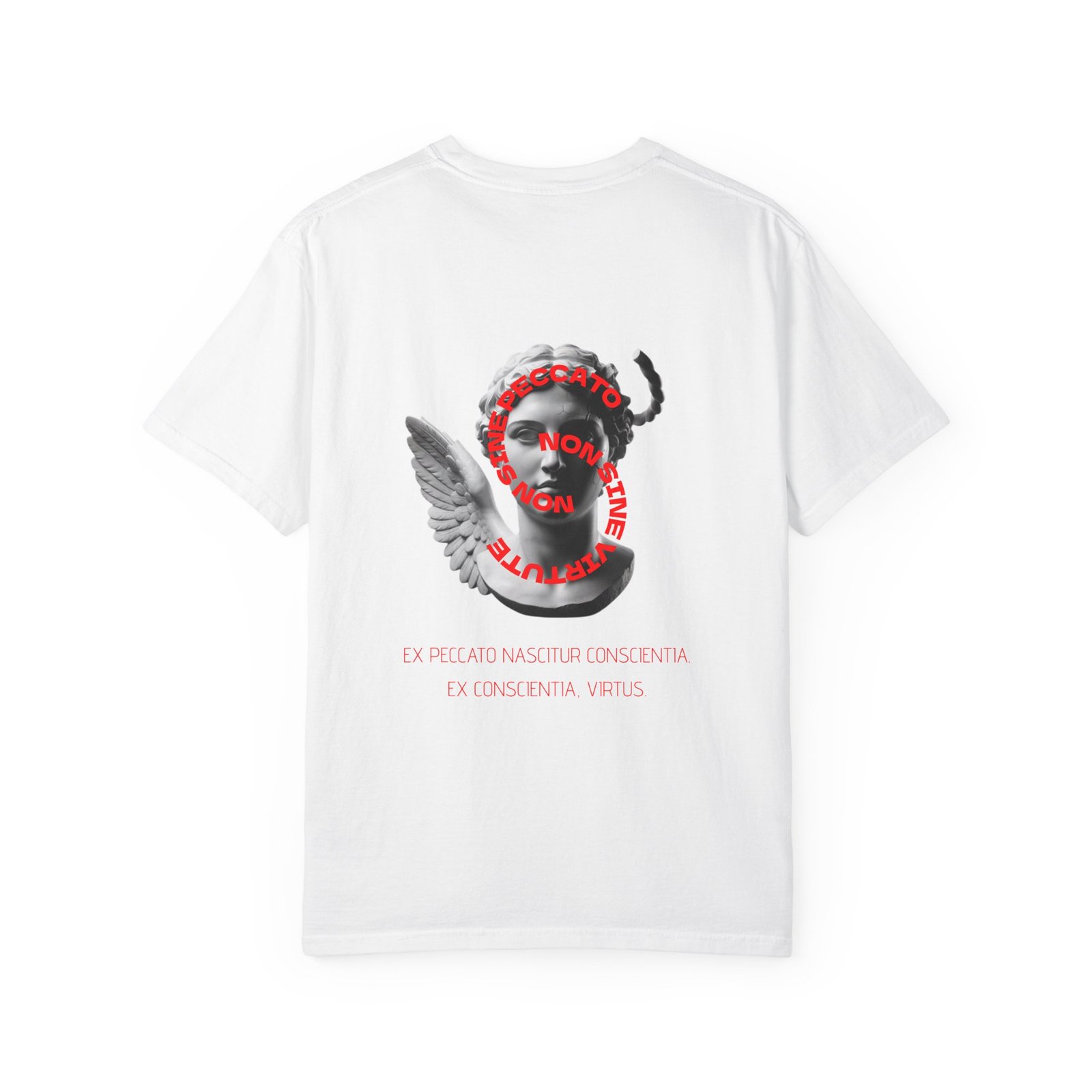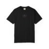 This heavyweight cotton tee carries a quiet, ancient presence. The monochrome Latin-style inscription sits centered in elegant Roman type, evoking the hush of a carved stone tablet or a candlelit scriptorium. It’s for those who favor understatement — people who collect meaning in simple marks and wear their intentions like armor. Soft garment-dyeing gives the shirt a lived-in, muted tone that deepens the classical feel, while the relaxed fit and sturdy construction let it be part of everyday rituals: reading in a sunlit room, wandering through old streets, or layering under a coat for a winter gathering. The result is a contemplative piece that reads like a personal talisman: subtle, somber, and quietly refined.